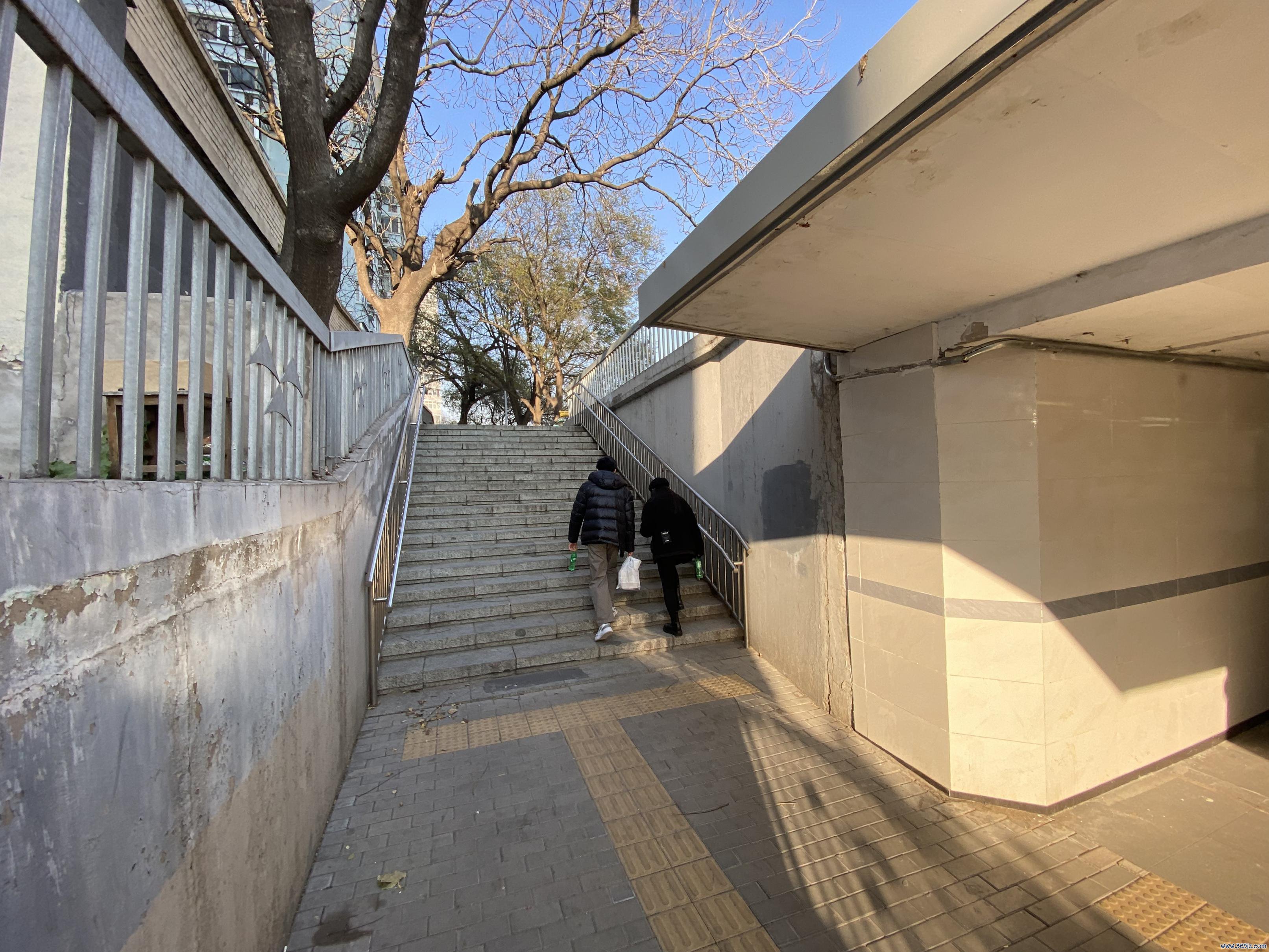 由于A口位于桥区低处,与北三环西路有约5米的高度差,出站的乘客想要到达路面,只能向上爬台阶。其中,正对着出站口的台阶直通北三环蓟门桥上,一路共有27级台阶。而去往蓟门桥西北角的市民,则要穿过一个桥洞。但桥洞西侧的人行道同样没有坡道,向西走的乘客要爬7级台阶才能到达路面,向北走的乘客更是要爬20级台阶才能到达路面,给无障碍出行带来了极大困难。